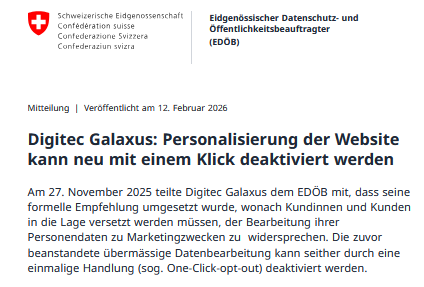 EDÖB: Deaktivierung von Marketing-Massnahmen mit 1-Klick-LösungVon Sven_Kohlmeier|2026-02-13T10:25:05+01:0016. Februar 2026|Kategorien: Allgemein, Datenschutz|WeiterlesenKommentare deaktiviert für EDÖB: Deaktivierung von Marketing-Massnahmen mit 1-Klick-Lösung