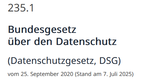 Bundesgesetz über den Datenschutz (Datenschutzgesetz, DSG)Von Sven_Kohlmeier|2026-02-05T17:11:14+01:0025. September 2020|Kategorien: Allgemein, Datenschutz, Gesetze|WeiterlesenKommentare deaktiviert für Bundesgesetz über den Datenschutz (Datenschutzgesetz, DSG)